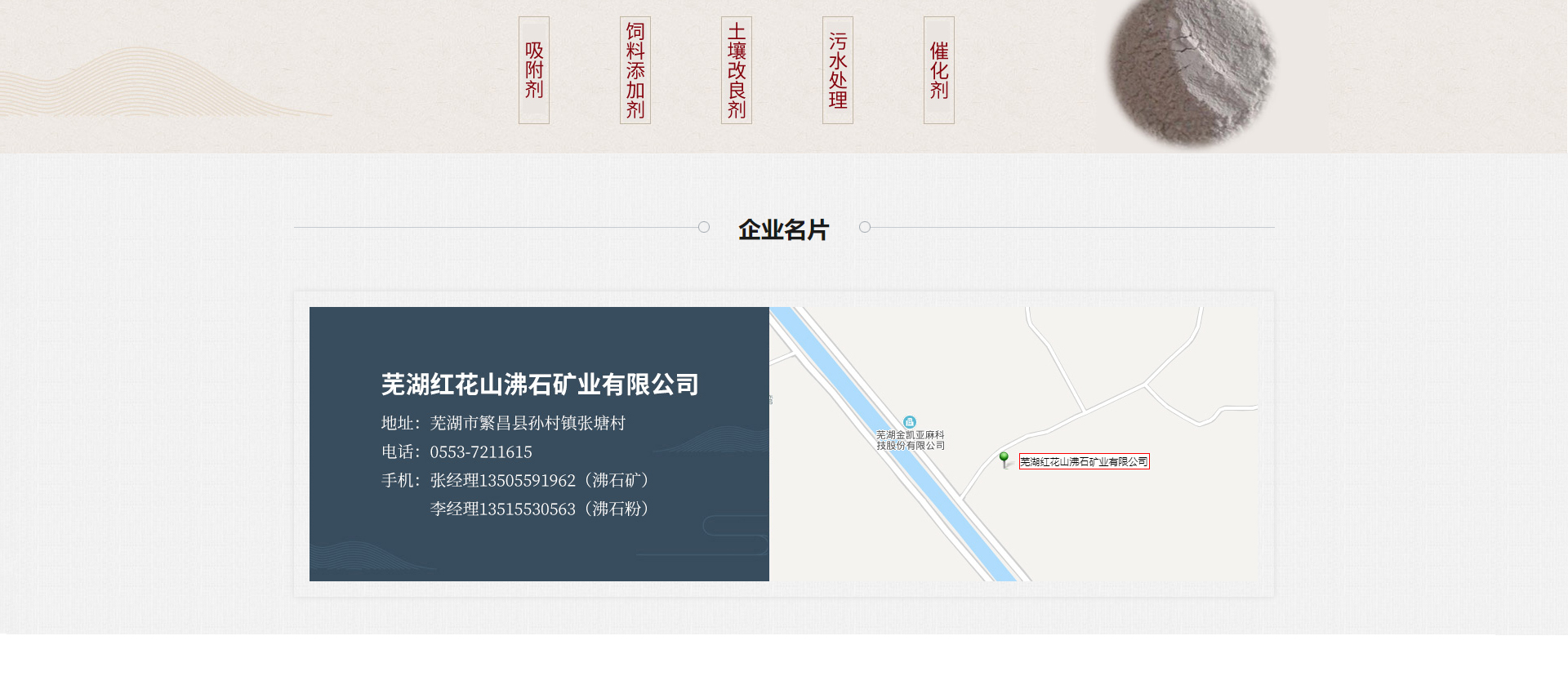 蕪湖紅花山沸石礦業(yè)有限公司距繁昌縣約18公里,有公路直達礦區(qū),距滬銅鐵路線的繁昌站、楓香墩站約20公里,礦區(qū)西側的赤沙河道直通荻港至長江,水路交通地理位置好。沸石是硅氧、鋁氧四面體構成的架狀硅酸鹽,有較大的比表面積和孔體體積。我礦沸石經321、803地質隊勘探儲量約一億噸以上,主要為絲光沸石(Ca、Na、K2)【ALSi2O2】27H2O,此外還含有石英、蒙脫石等,經合肥工業(yè)大學、蕪湖市科委、華東冶金地質礦產研究所、南京地礦研究院等單位測試測定沸石含為55%—68%。